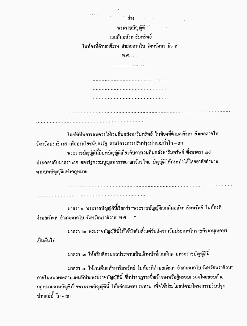 • ร่างพระราชบัญญัติเวนคืนอสังหาริมทรัพย์ในท้องที่ตำบลเจ๊ะเห อำเภอตากใบจังหวัดนราธิวาส พ.ศ. .....