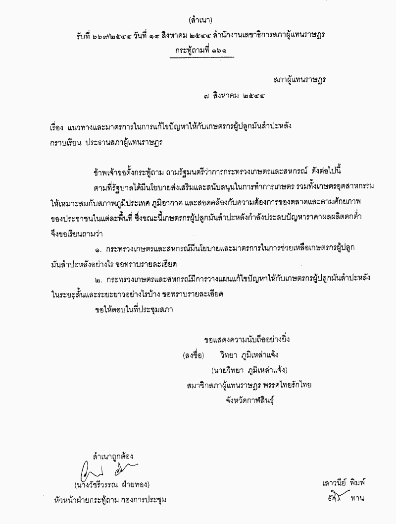 กระทู้ถามที่ 161 เรื่อง แนวทางและมาตรการในการแก้ไขปัญหาให้กับเกษตรกรผู้ปลูกมันสำปะหลัง นายวิทยา ภูมิเหล่าแจ้ง เป็นผู้ตั้งกระทู้ถาม ถามรัฐมนตรีว่าการกระทรวงเกษตรและสหกรณ์ |
