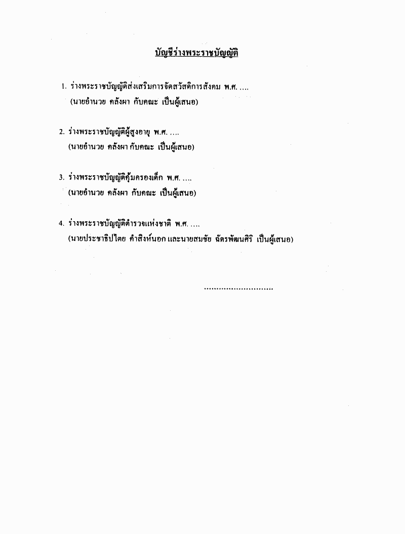 • ร่างพระราชบัญญัติส่งเสิรมการจัดสวัสดิการสังคม พ.ศ..... (นายอำนวย คลังผา กับคณะ เป็นผู้เสนอ) (เป็นร่างพระราชบัญญัติที่มีสาระเกี่ยวกับเด็ก และคนชรา หรือผู้พิการหรือผู้ทุพพลภาพตามมาตรา 190 ของรัฐธรรมนูญแห่งราชอาณาจักรไทย)