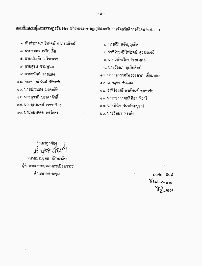 • ร่างพระราชบัญญัติส่งเสิรมการจัดสวัสดิการสังคม พ.ศ..... (นายอำนวย คลังผา กับคณะ เป็นผู้เสนอ) (เป็นร่างพระราชบัญญัติที่มีสาระเกี่ยวกับเด็ก และคนชรา หรือผู้พิการหรือผู้ทุพพลภาพตามมาตรา 190 ของรัฐธรรมนูญแห่งราชอาณาจักรไทย)