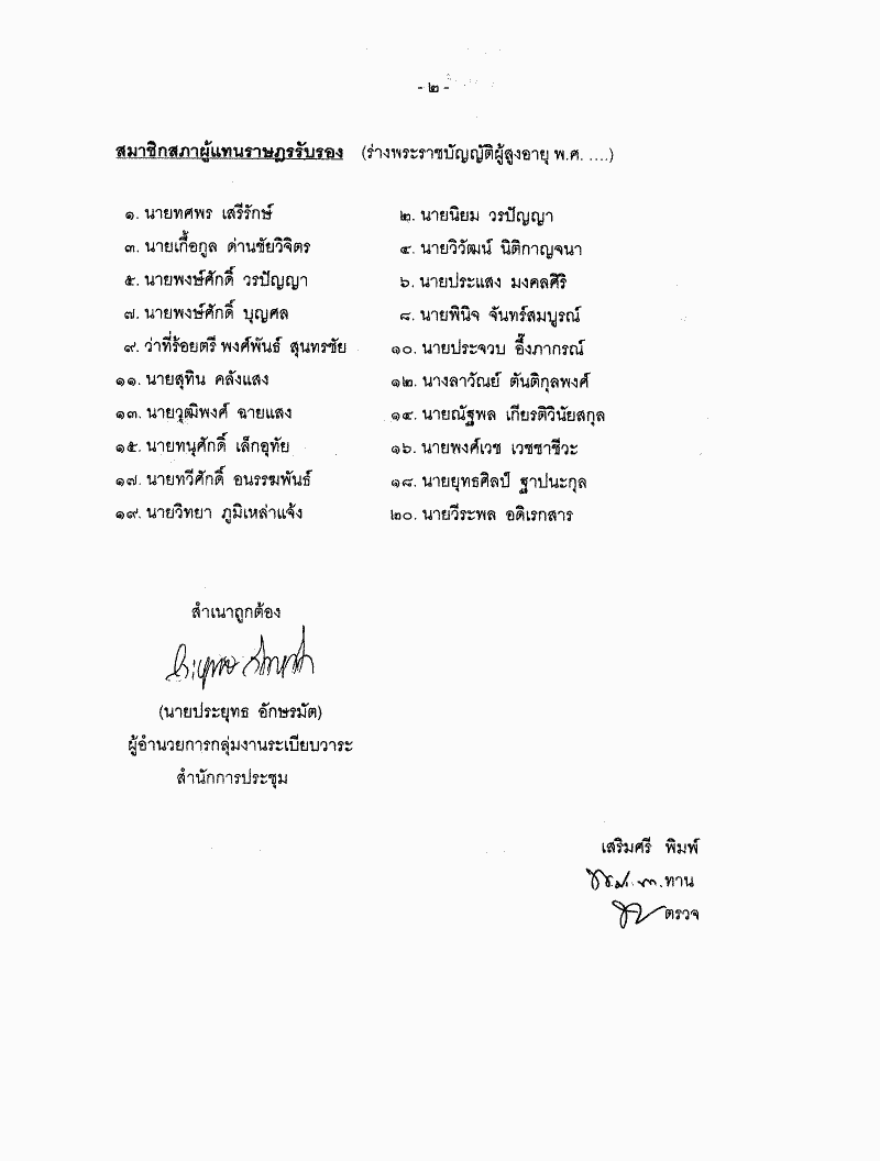 • ร่างพระราชบัญญัติผู้สูงอายุ พ.ศ..... (นายอำนวย คลังผา กับคณะ เป็นผู้เสนอ) (เป็นร่างพระราชบัญญัติที่มีสาระเกี่ยวคนชรา ตามมาตรา 190 ของรัฐธรรมนูญแห่งราชอาณาจักรไทย)