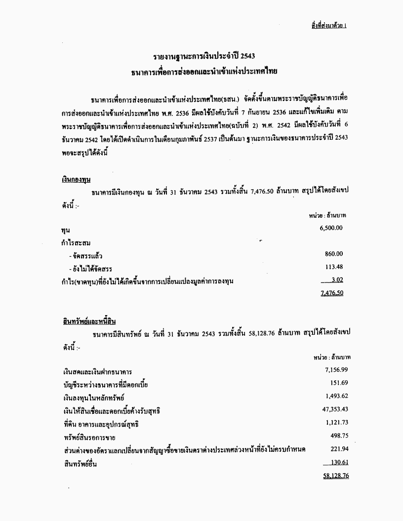 ชื่อเอกสาร :   รับทราบรายงานกิจการประจำปี งบดุล บัญชีกำไรและขาดทุนของธนาคารเพื่อการส่งออกและนำเข้าแห่งประเทศไทย ประจำปี 2543