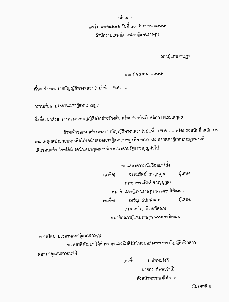• ร่างพระราชบัญญัติทางหลวง (ฉบับที่..) พ.ศ..... (นายวรรณรัตน์ ชาญนุกูล และนายเทวัญ ลิปตพัลลภ เป็นผู้เสนอ)