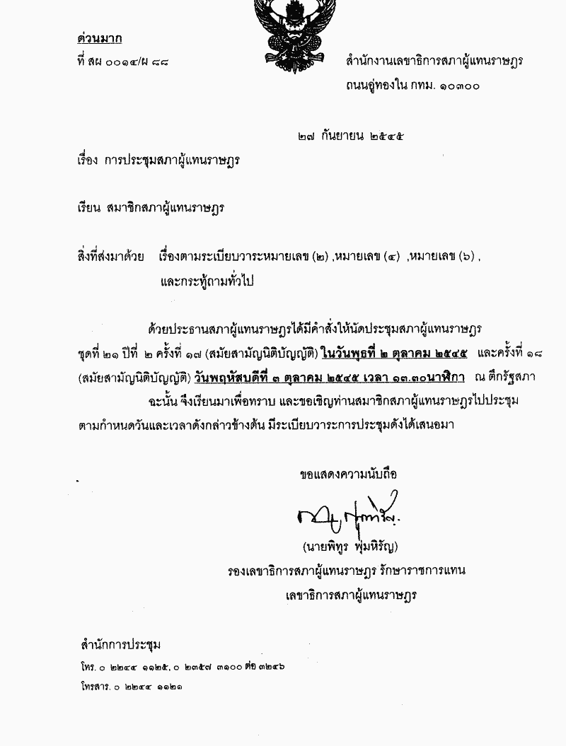 • ระเบียบวาระการประชุมสภาผู้แทนราษฎร ชุดที่ 21 ปีที่ 2 ครั้งที่ 17 (สมัยสามัญนิติบัญญัติ) วันพุธที่ 2 ตุลาคม 2545