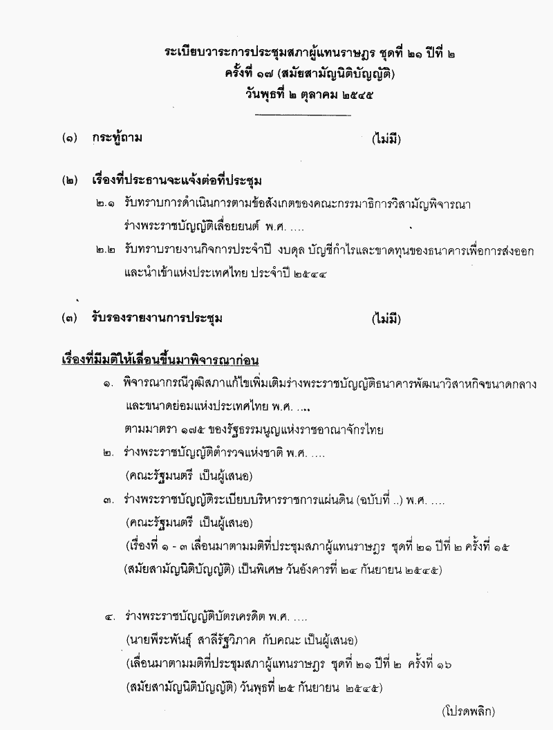 ระเบียบวาระการประชุมสภาผู้แทนราษฎร ชุดที่ 21 ปีที่ 2 ครั้งที่ 17 (สมัยสามัญนิติบัญญัติ) วันพุธที่ 2 ตุลาคม 2545 |