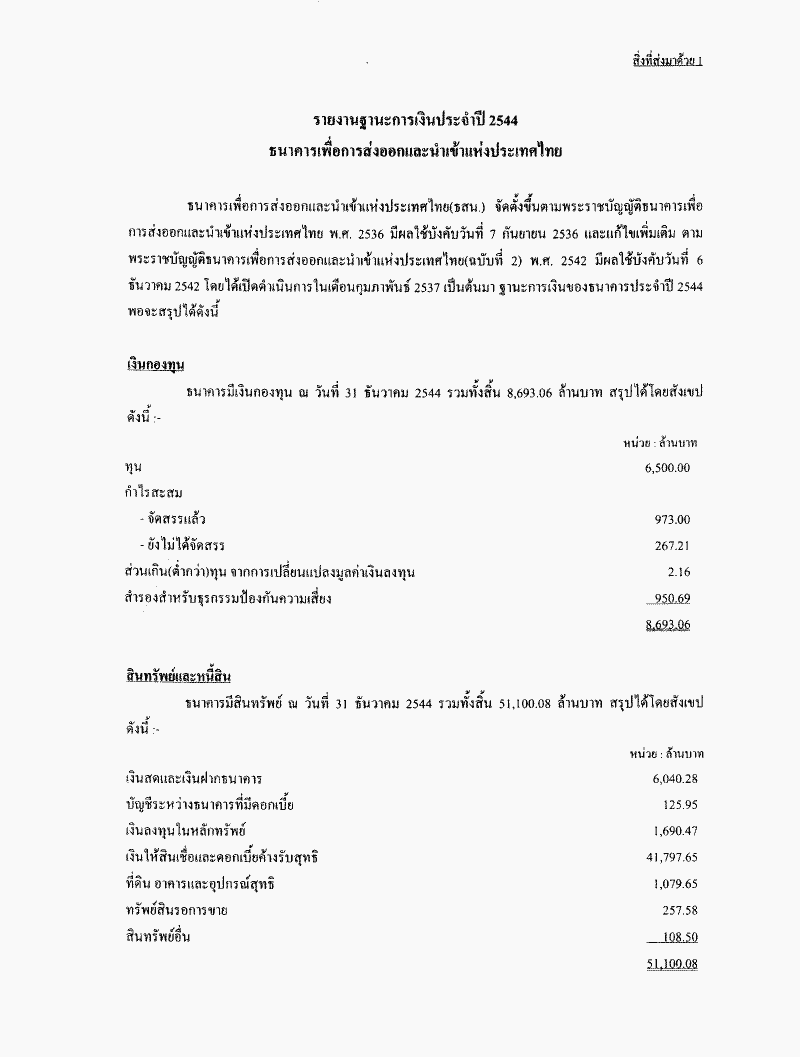 ชื่อเอกสาร :   รับทราบรายงานกิจการประจำปี งบดุล บัญชีกำไรและขาดทุนของธนาคารเพื่อการส่งออกและนำเข้าแห่งประเทศไทย ประจำปี 2544