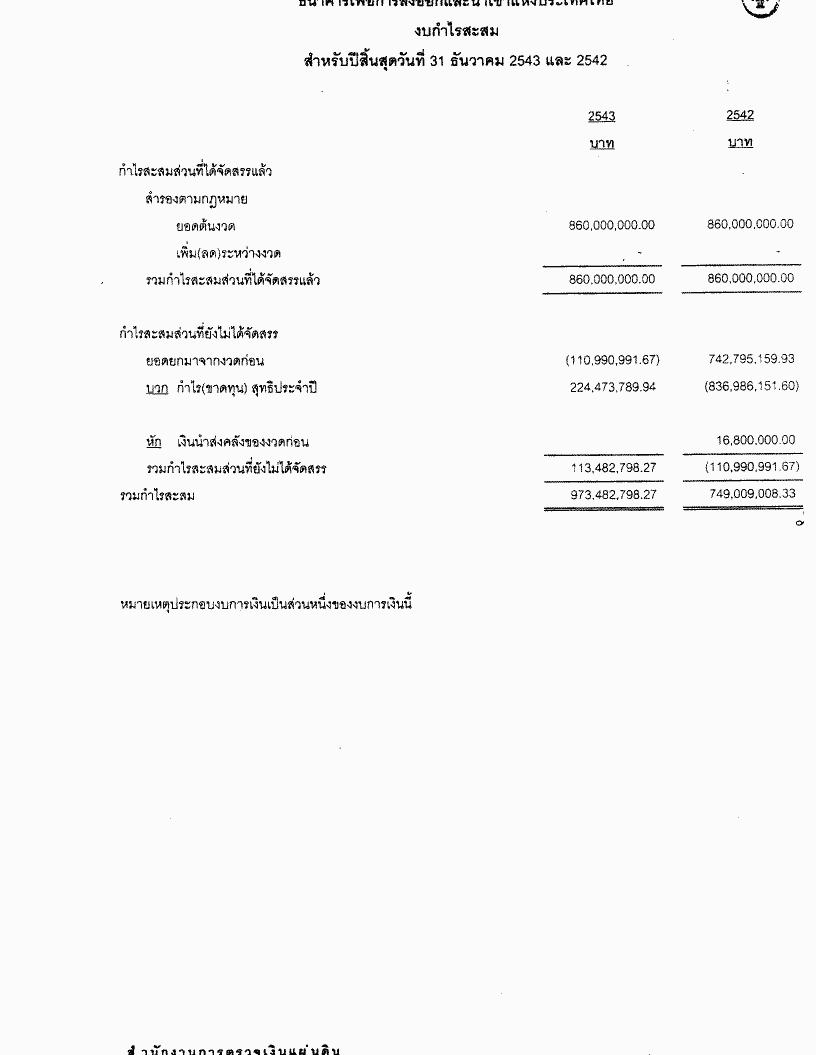• รายงานกิจการประจำปี งบดุล บัญชีกำไรและขาดทุนของธนาคารเพื่อการส่งออกและนำเข้าแห่งประเทศไทย ประจำปี 2543