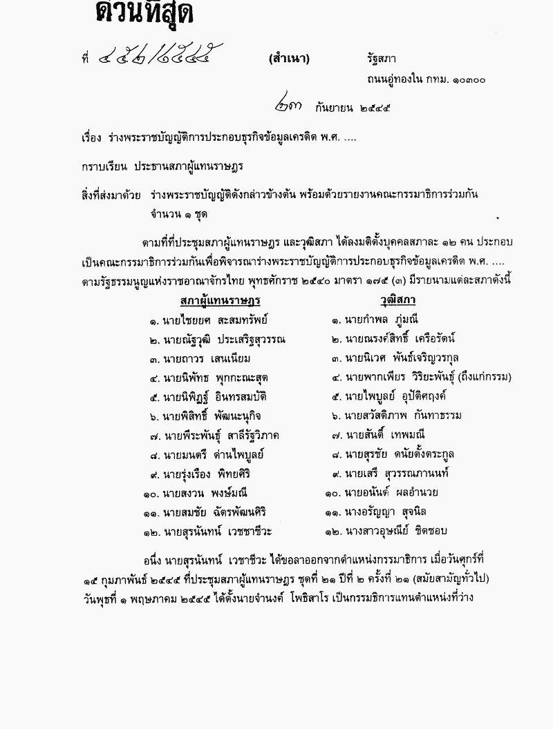 ร่างพระราชบัญญัติการประกอบธุรกิจข้อมูลเครดิต พ.ศ.... ซึ่งคณะกรรมาธิการร่วมกันพิจารณาเสร็จแล้ว