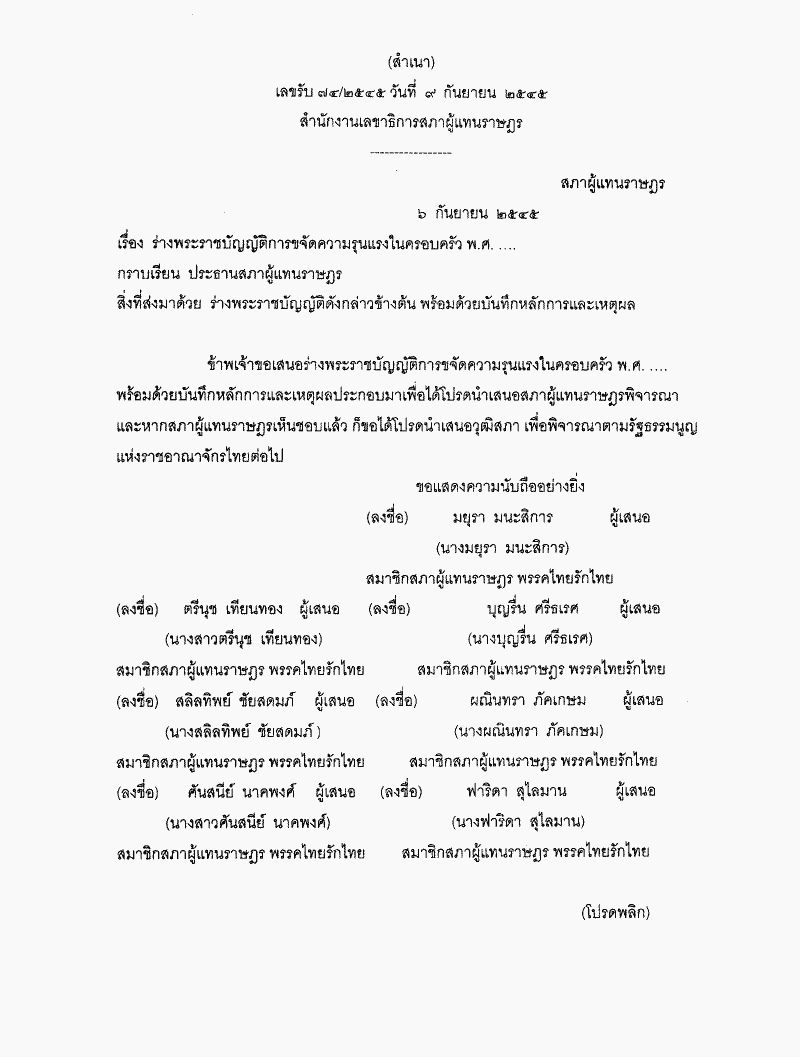 ร่างพระราชบัญญัติการขจัดความรุนแรงในครอบครัว พ.ศ. .... (นางมยุรา มนะสิการ กับคณะ เป็นผู้เสนอ) |