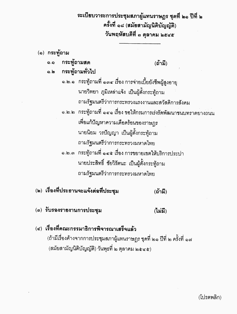 • ระเบียบวาระการประชุมสภาผู้แทนราษฎร ชุดที่ 21 ปีที่ 2 ครั้งที่ 18 (สมัยสามัญนิติบัญญัติ) วันพฤหัสบดีที่ 3 ตุลาคม 2545