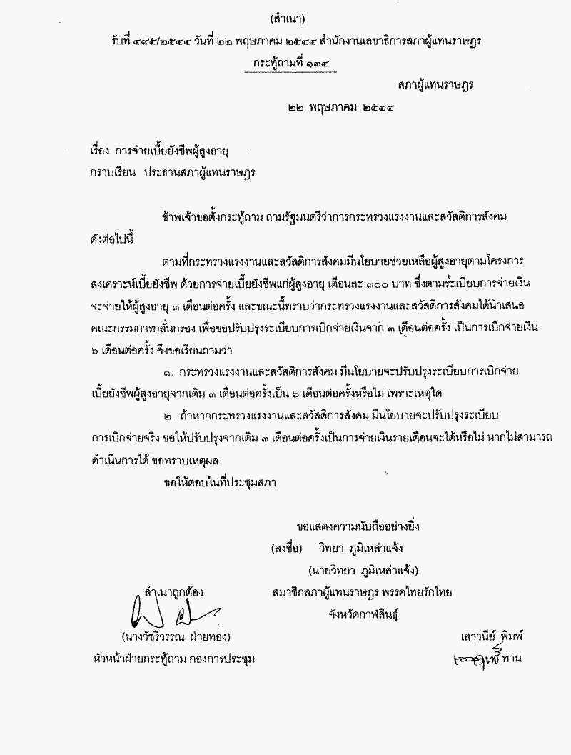 กระทู้ถามที่ 134 เรื่อง การจ่ายเบี้ยยังชีพผู้สูงอายุ นายวิทยา ภูมิเหล่าแจ้ง เป็นผู้ตั้งกระทู้ถาม ถามรัฐมนตรีว่าการกระทรวงแรงงานและสวัสดิการสังคม |