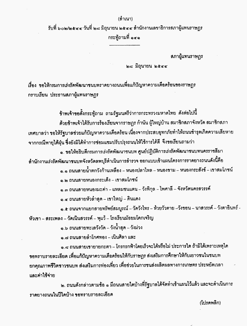 ขอให้กรมการเร่งรัดพัฒนาชนบทราดยางถนนเพื่อแก้ปัญหาความเดือดร้อนของราษฎร |
