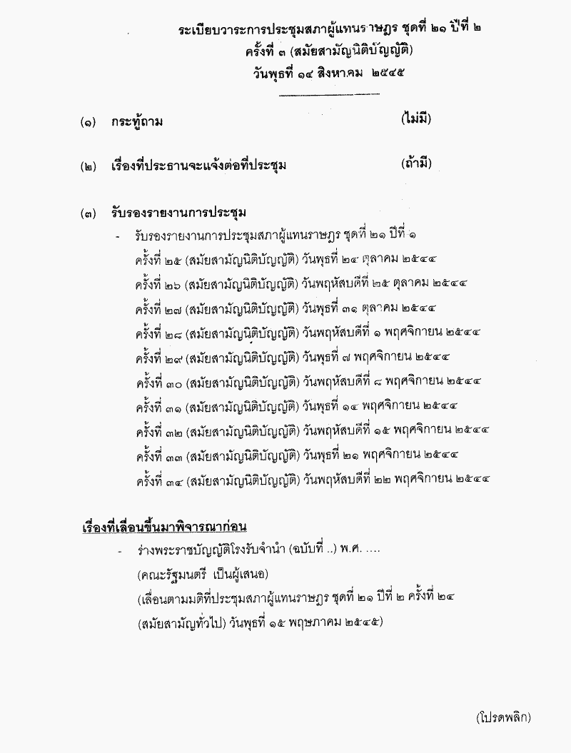 • ระเบียบวาระการประชุมสภาผู้แทนราษฎร ชุดที่ 21 ปีที่ 2 ครั้งที่ 3 (สมัยสามัญนิติบัญญัติ) วันพุธที่ 14 สิงหาคม 2545