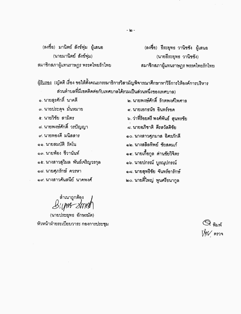 ขอเสนอญัตติ เรื่อง ขอให้ตั้งคณะกรรมาธิการวิสามัญพิจารณาศึกษาหาวิธีการให้องค์การบริหารส่วนตำบลที่มีเขตติดต่อกับเทศบาลได้รวมเป็นส่วนหนึ่งของเทศบาล |