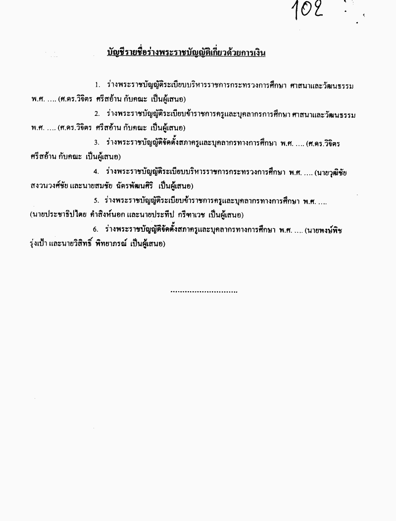• ร่างพระราชบัญญัติระเบียบบริหารราชการกระทรวงการศึกษา ศาสนา และวัฒนธรรม (ศาสตราจารย์วิจิตร ศรีสอ้าน กับคณะ เป็นผู้เสนอ)