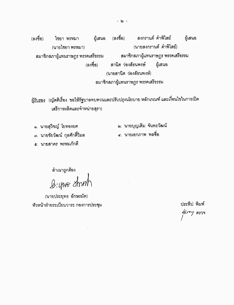 ขอเสนอญัตติ เรื่อง ขอให้รัฐบาลทบทวนและปรับปรุงนโยบาย หลักเกณฑ์ และเงื่อนไขในการเปิดเสรีการผลิตและจำหน่ายสุรา |