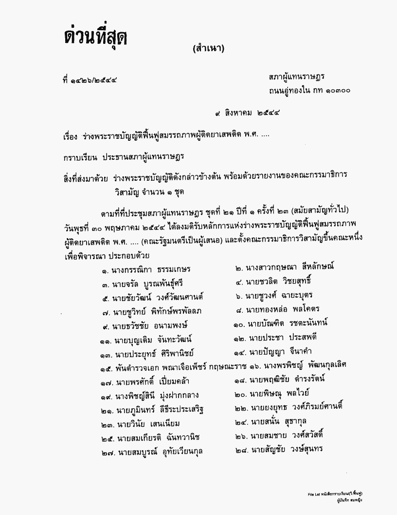 ร่างพระราชบัญญัติฟื้นฟูสมรรถภาพผู้ติดยาเสพติด พ.ศ... ซึ่งคณะกรรมาธิการวิสามัญพิจารณาเสร็จแล้ว