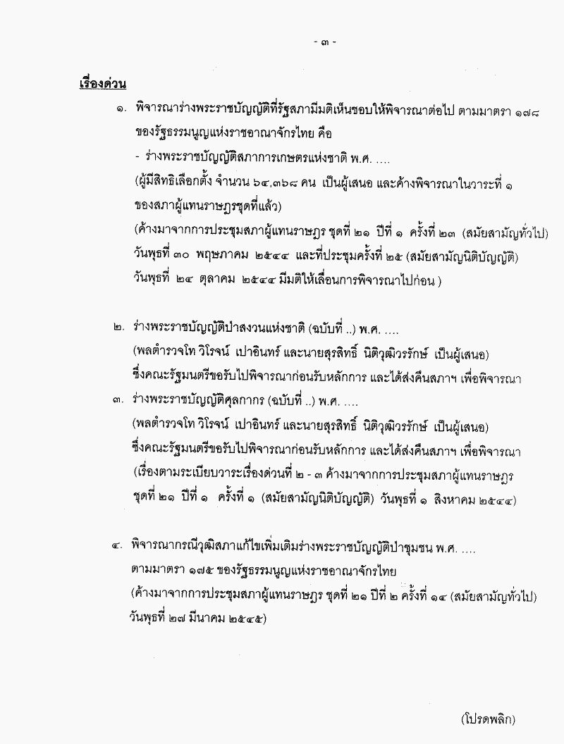 • ระเบียบวาระการประชุมสภาผู้แทนราษฎร ชุดที่ 21 ปีที่ 2 ครั้งที่ 23 (สมัยสามัญนิติบัญญัติ) วันพฤหัสบดีที่ 24 ตุลาคม 2545