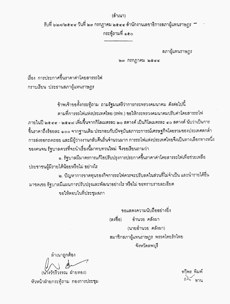 กระทู้ถามที่ 150 เรื่อง การประกาศขึ้นราคาค่าโดยสารรถไฟ นายอำนวย คลังผา เป็นผู้ตั้งกระทู้ถาม ถามรัฐมนตรีว่าการกระทรวงคมนาคม |