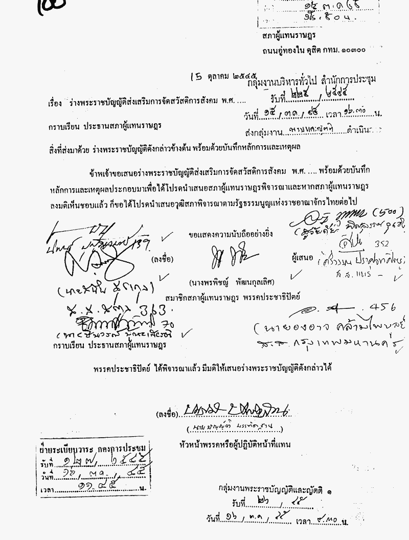 • ร่างพระราชบัญญัติส่งเสริมการจัดสวัสดิการสังคม พ.ศ..... (คณะรัฐมนตรี เป็นผู้เสนอ) (เป็นร่างพระราชบัญญัติที่มีสาระเกี่ยวกับเด็ก และคนชรา หรือผู้พิการหรือผู้ทุพพลภาพตามมาตรา 190 ของรัฐธรรมนูญแห่งราชอาณาจักรไทย)