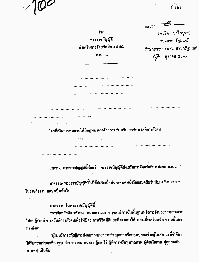 ชื่อเอกสาร :   ร่างพระราชบัญญัติส่งเสริมการจัดสวัสดิการสังคม พ.ศ..... (คณะรัฐมนตรี เป็นผู้เสนอ) (เป็นร่างพระราชบัญญัติที่มีสาระเกี่ยวกับเด็ก และคนชรา หรือผู้พิการหรือผู้ทุพพลภาพตามมาตรา 190 ของรัฐธรรมนูญแห่งราชอาณาจักรไทย)