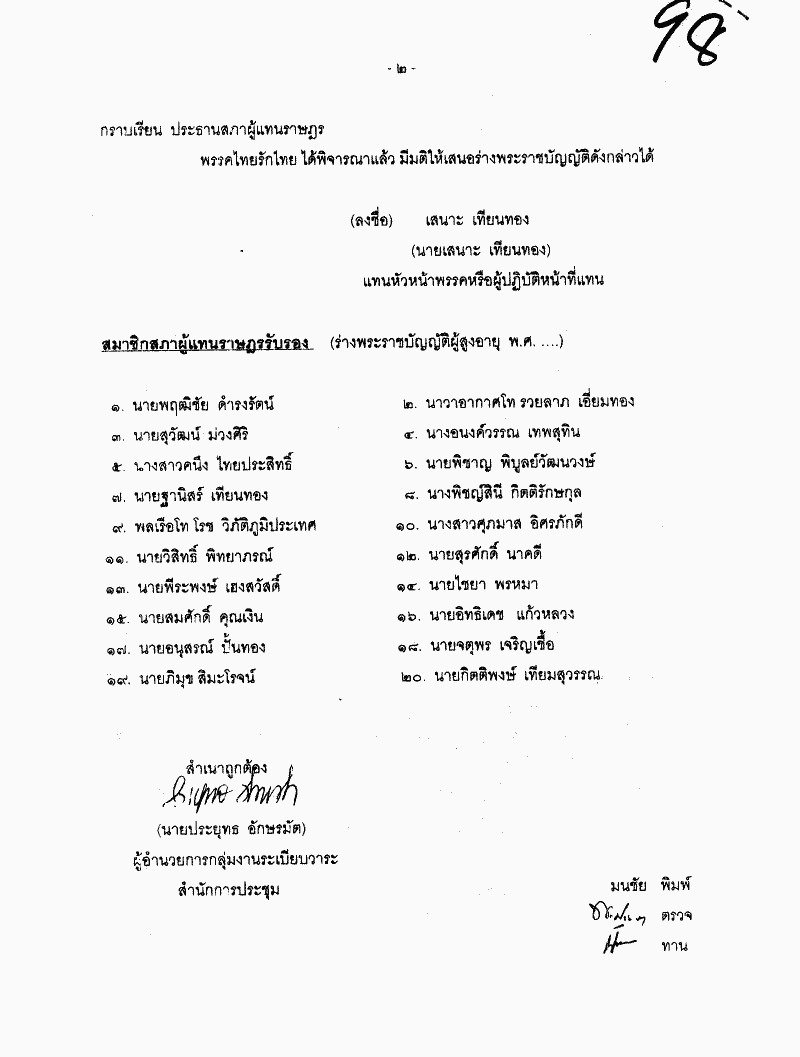 ชื่อเอกสาร :   ร่างพระราชบัญญัติผู้สูงอายุ พ.ศ..... (นายประเสริฐ จันทรรวงทอง กับคณะ เป็นผู้เสนอ) (เป็นร่างพระราชบัญญัติที่มีสาระเกี่ยวกับคนชราตามมาตรา 190 ของรัฐธรรมนูญแห่งราชอาณาจักรไทย)