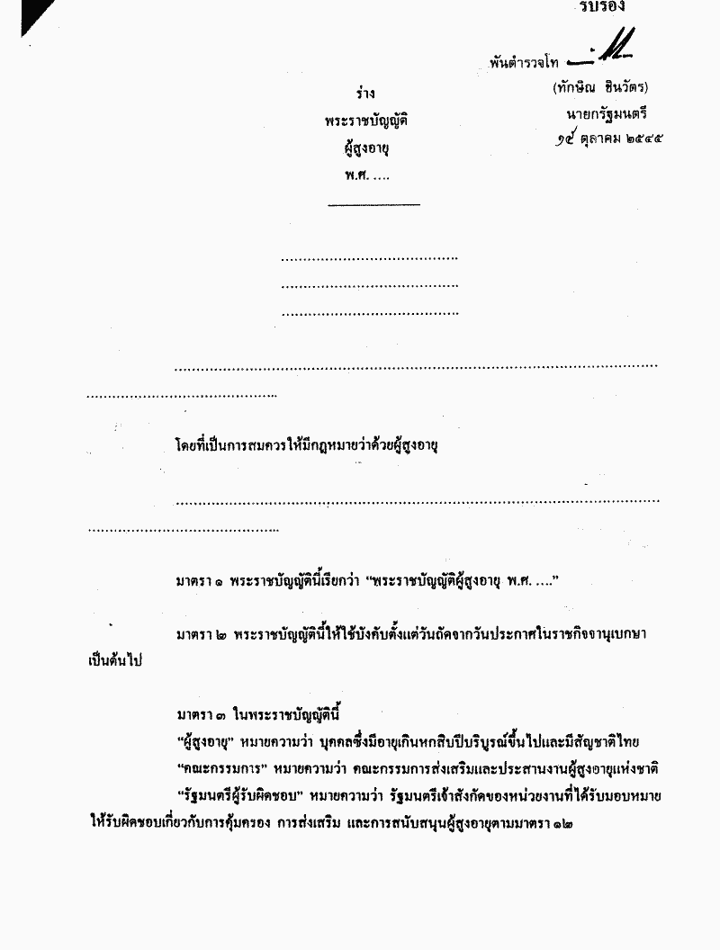 ชื่อเอกสาร :   ร่างพระราชบัญญัติผู้สูงอายุ พ.ศ..... (นายประเสริฐ จันทรรวงทอง กับคณะ เป็นผู้เสนอ) (เป็นร่างพระราชบัญญัติที่มีสาระเกี่ยวกับคนชราตามมาตรา 190 ของรัฐธรรมนูญแห่งราชอาณาจักรไทย)