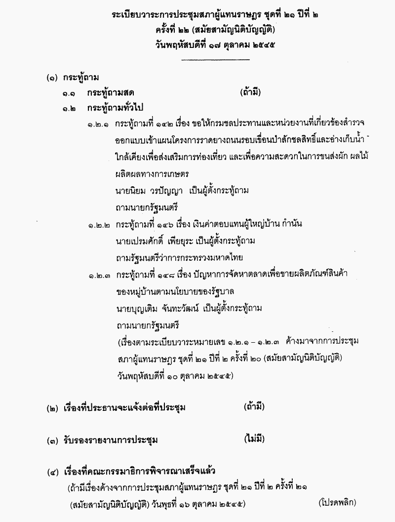 • ระเบียบวาระการประซุมสภาผู้แทนราษฎรชุดที่ 21 ปีที่ 2 ครั้งที่ 22 (สมัยสามัญนิติบัญญัติ) วันพฤหัสบดีที่ 17 ตุลาคม 2545