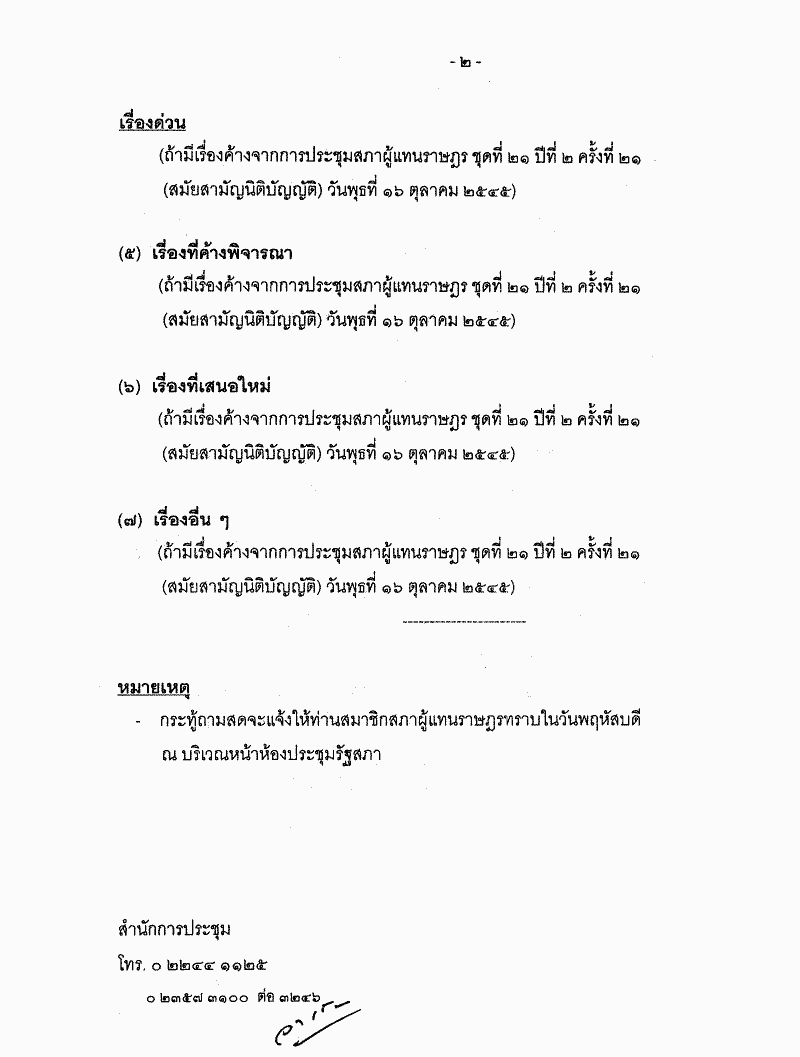 ระเบียบวาระการประซุมสภาผู้แทนราษฎรชุดที่ 21 ปีที่ 2 ครั้งที่ 22 (สมัยสามัญนิติบัญญัติ) วันพฤหัสบดีที่ 17 ตุลาคม 2545 |