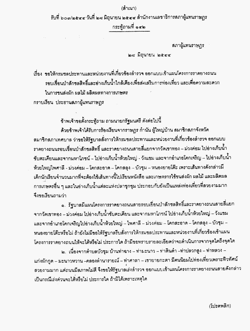 กระทู้ถามที่ 142 เรื่อง ขอให้กรมชลประทานและหน่วยงานที่เกี่ยวข้องสำรวจออกแบบเข้าแผนโครงการราดยางถนนรอบเขื่อนป่าสักชลสิทธิ์และอ่างเก็บน้ำใกล้เคียงเพื่อส่งเสริมการท่องเที่ยว และเพื่อความสะดวกในการขนส่งผัก ผลไม้ผลิตผลทางการเกษตร นายนิยม วรปัญญา เป็นผู้ตั้งกระทู้ถาม ถามนายกรัฐมนตรี |