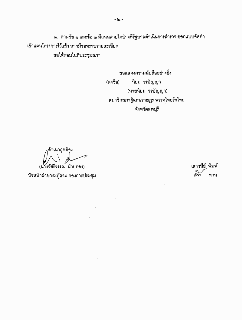 • กระทู้ถามที่ 142 เรื่อง ขอให้กรมชลประทานและหน่วยงานที่เกี่ยวข้องสำรวจออกแบบเข้าแผนโครงการราดยางถนนรอบเขื่อนป่าสักชลสิทธิ์และอ่างเก็บน้ำใกล้เคียงเพื่อส่งเสริมการท่องเที่ยว และเพื่อความสะดวกในการขนส่งผัก ผลไม้ผลิตผลทางการเกษตร นายนิยม วรปัญญา เป็นผู้ตั้งกระทู้ถาม ถามนายกรัฐมนตรี