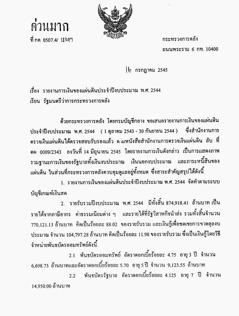 รับทราบรายงานการเงินของแผ่นดิน ประจำปีงบประมาณ พ.ศ. 2544