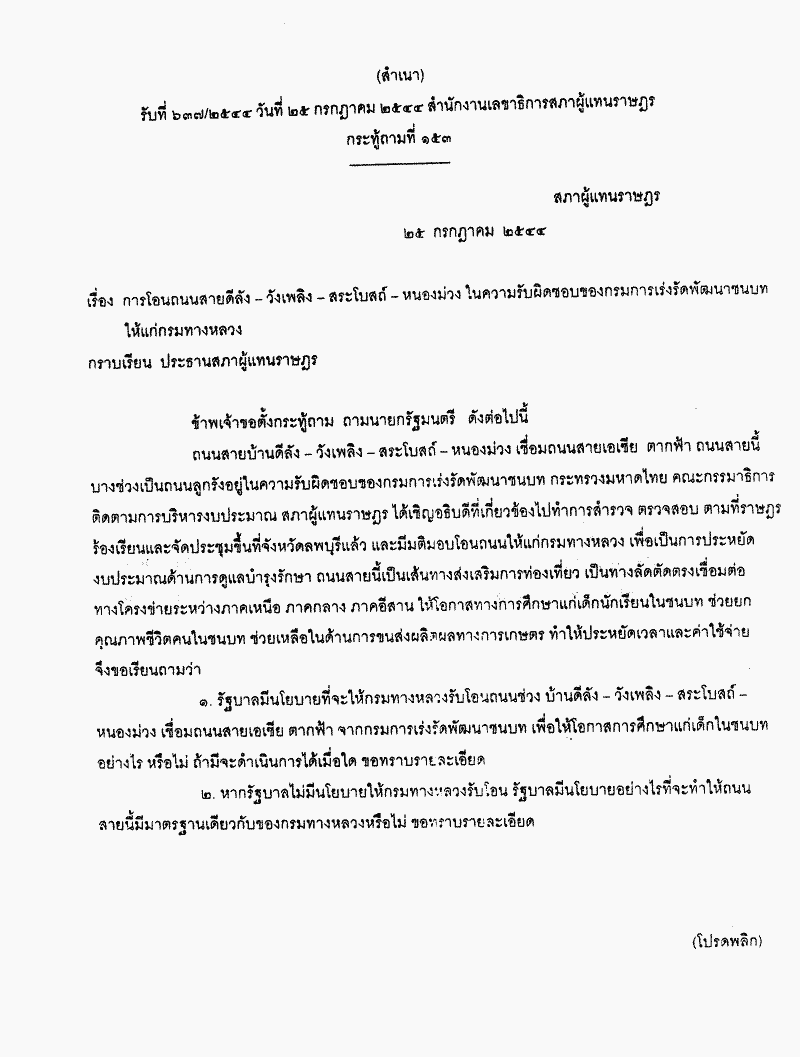 กระทู้ถามที่ 153 เรื่อง การโอนถนนสายดีลัง - วังเพลิง - สระโบสถ์ - หนองม่วงในความรับผิดชอบของกรมการเร่งรัดพัฒนาชนบทให้แก่กรมทางหลวง นายนิยม วรปัญญา เป็นผู้ตั้งกระทู้ถาม ถามนายกรัฐมนตรี |