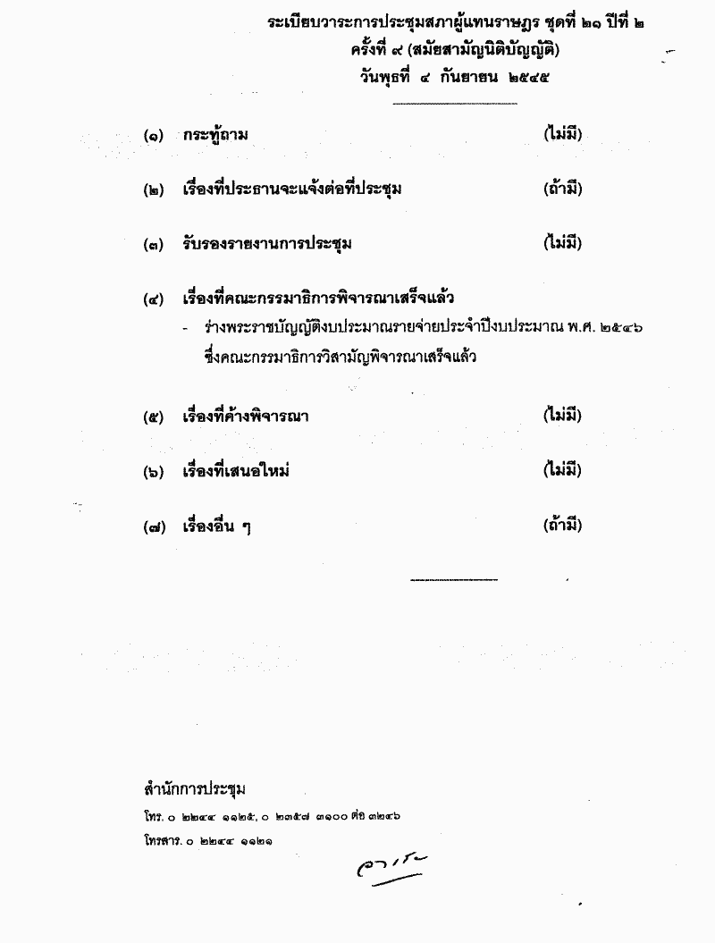 • ระเบียบวาระการประชุมสภาผู้แทนราษฎร ชุดที่ 21 ปีที่ 2 ครั้งที่ 9 (สมัยสามัญนิติบัญญัติ) วันพุธที่ 4 กันยายน 2545