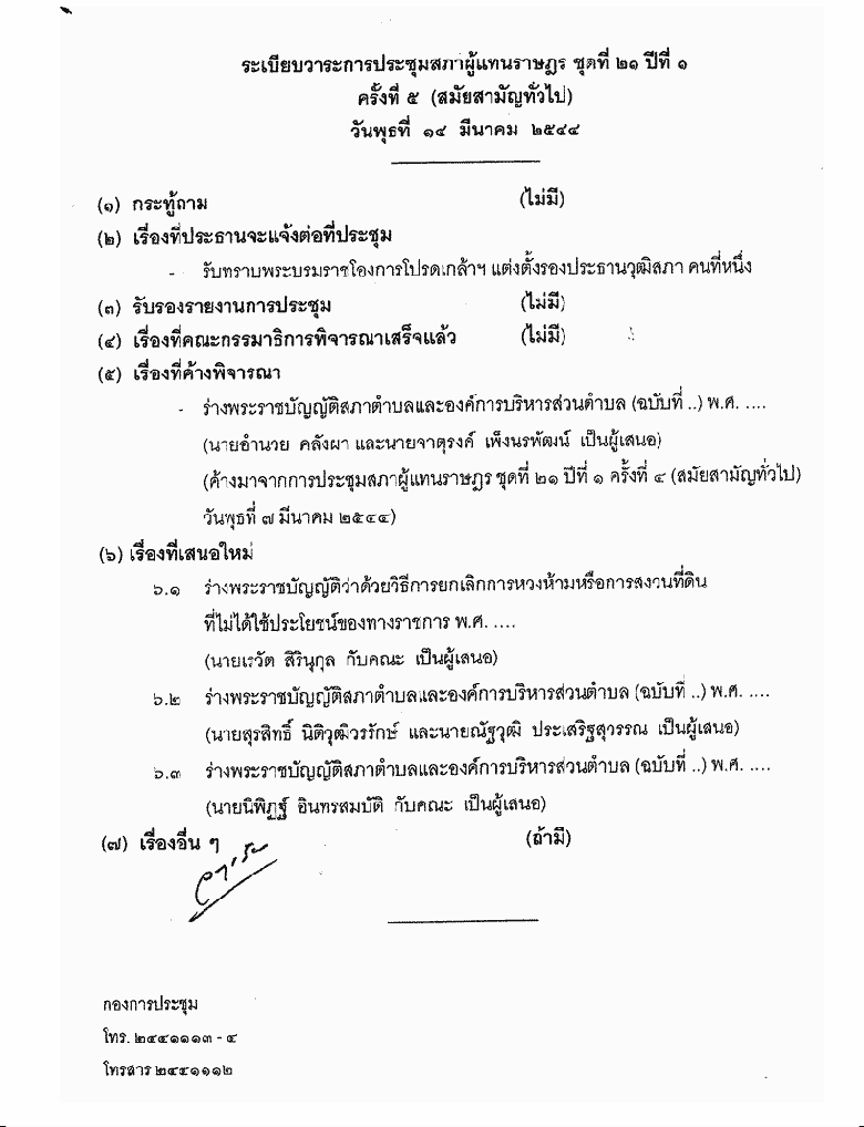 ชื่อเอกสาร : ระเบียบวาระการประชุมสภาผู้แทนราษฎร ชุดที่ ๒๑ ปีที่ ๑ ครั้งที่ ๕ (สมัยสามัญทั่วไป) วันพุธที่ ๑๔ มีนาคม ๒๕๔๔