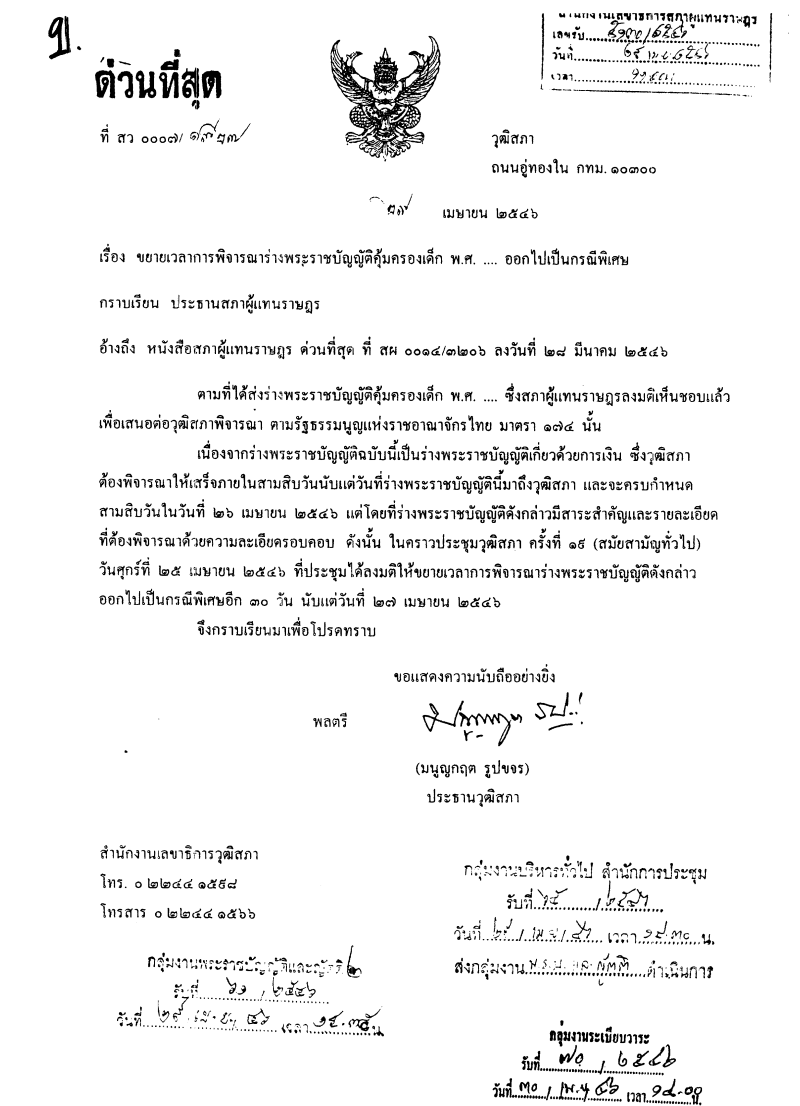 ขยายเวลาการพิจารณาร่างพระราชบัญญัติคุ้มครองเด็ก พ.ศ..... ออกไปเป็นกรณีพิเศษ |