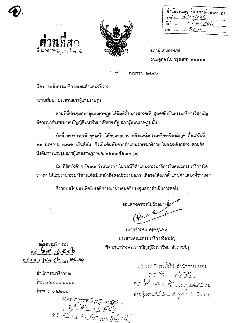 ตั้งซ่อมกรรมาธิการวิสามัญพิจารณาร่างพระราชบัญญัติมหาวิทยาลัยราชภัฏ พ.ศ. .... แทนตำแหน่งที่ว่างลง 1 ตำแหน่ง เพราะลาออก (นางสาวอรดี สุทธศรี) |