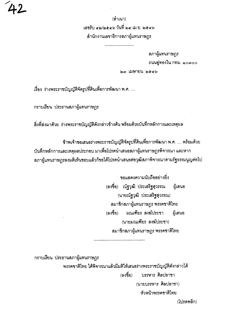 • ร่างพระราชบัญญัติจัดรูปที่ดินเพื่อการพัฒนา พ.ศ.... (นายณัฐวุฒิ ประเสริฐสุวรรณ และนายมณเฑียร สงฆ์ประชา เป็นผู้เสนอ)