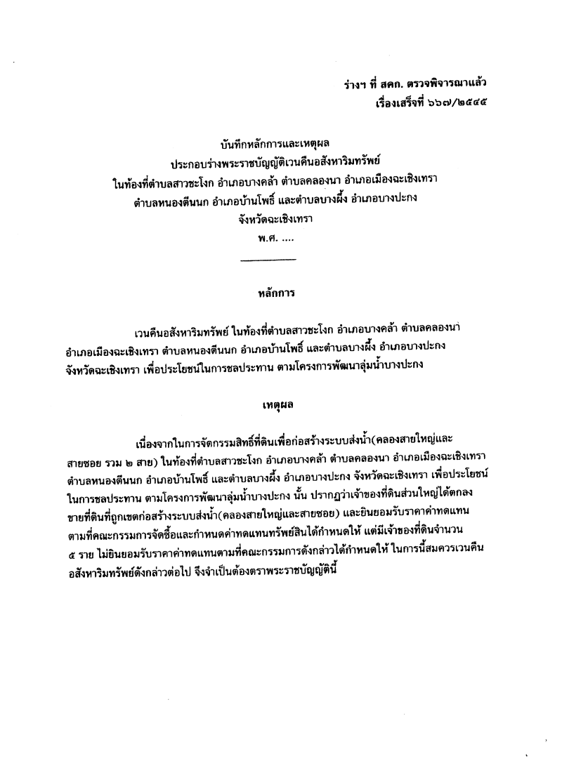 ชื่อเอกสาร :   ร่างพระราชบัญญัติเวนคืนอสังหาริมทรัพย์ ในท้องที่ตำบลสาวชะโงก อำเภอบางคล้ำ ตำบลคลองนา อำเภอเมืองฉะเชิงเทรา ตำบลหนองตีนนก อำเภอบ้านโพธิ์ และตำบลบางผึ้ง อำเภอบางปะกง จังหวัดฉะเชิงเทรา พ.ศ..... (คณะรัฐมนตรี เป็นผู้เสนอ)