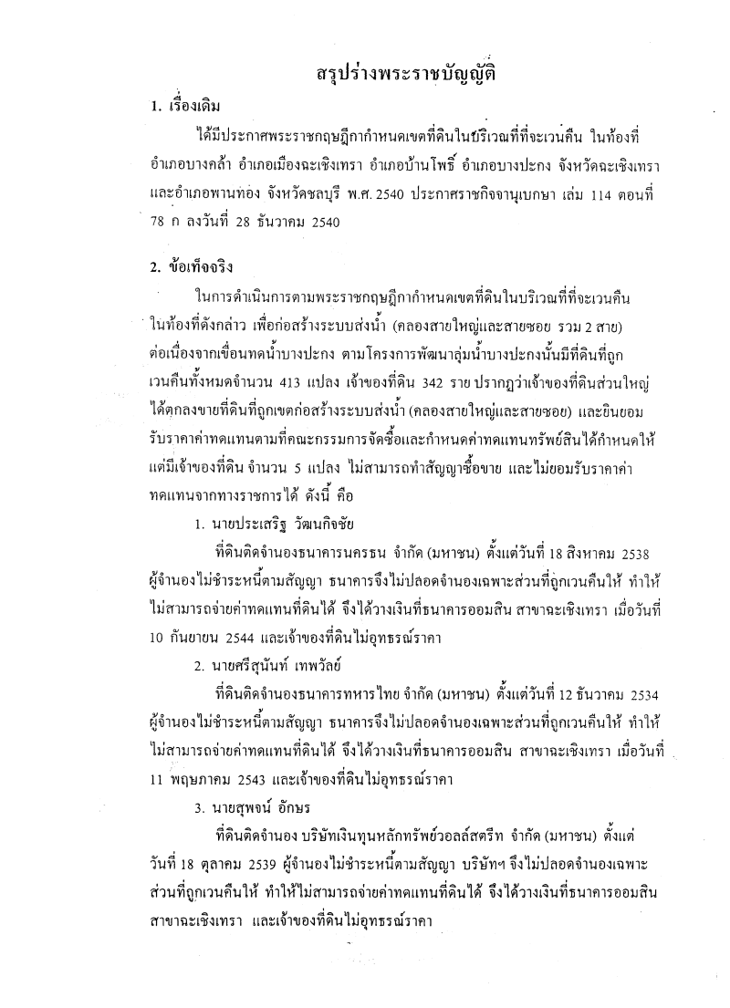 ชื่อเอกสาร :   ร่างพระราชบัญญัติเวนคืนอสังหาริมทรัพย์ ในท้องที่ตำบลสาวชะโงก อำเภอบางคล้ำ ตำบลคลองนา อำเภอเมืองฉะเชิงเทรา ตำบลหนองตีนนก อำเภอบ้านโพธิ์ และตำบลบางผึ้ง อำเภอบางปะกง จังหวัดฉะเชิงเทรา พ.ศ..... (คณะรัฐมนตรี เป็นผู้เสนอ)