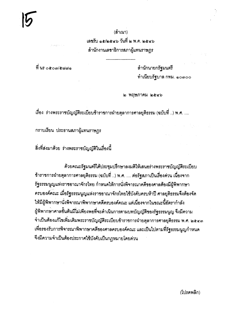 • ร่างพระราชบัญญัติระเบียบข้าราชการฝ่ายตุลาการศาลยุติธรรม (ฉบับที่..) พ.ศ..... (คณะรัฐมนตรี เป็นผู้เสนอ)