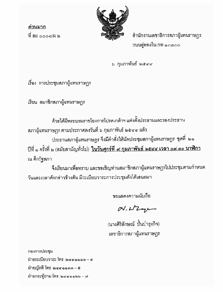 ชื่อเอกสาร : ระเบียบวาระการประชุมสภาผู้แทนราษฎร ชุดที่ ๒๑ ปีที่ ๑ ครั้งที่ ๒ (สมัยสามัญทั่วไป) วันศุกร์ที่ ๙ กุมภาพันธ์ ๒๕๔๔