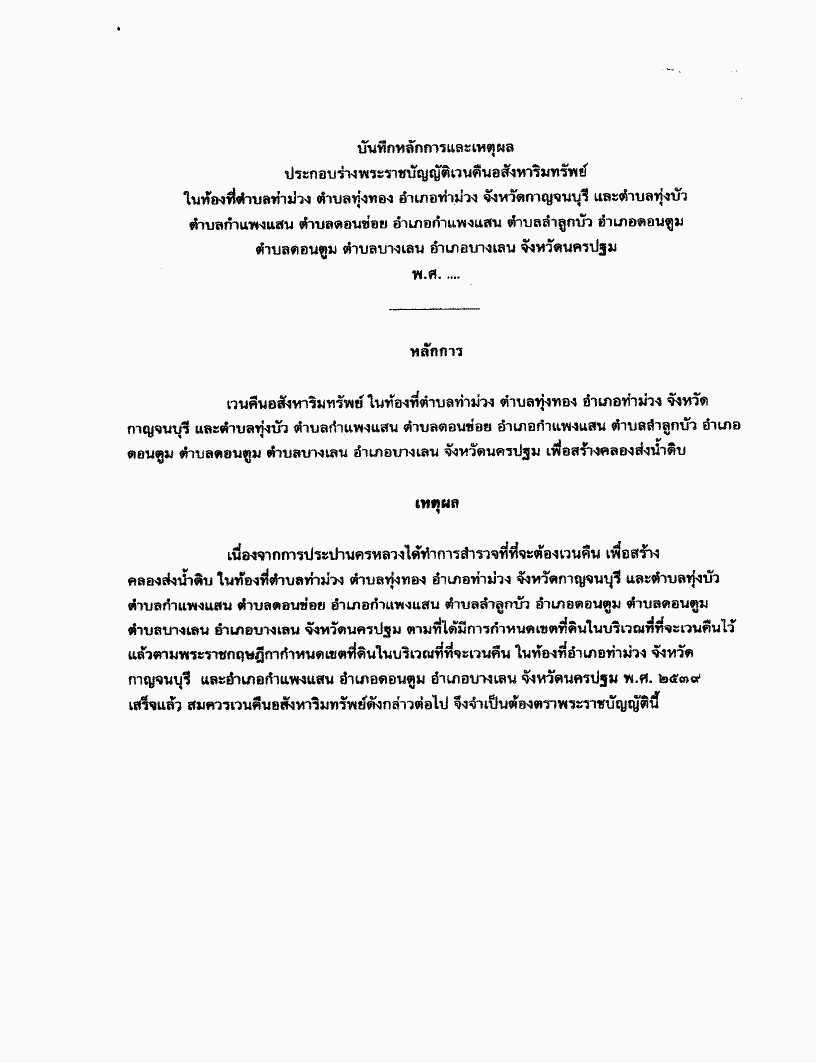 ร่างพระราชบัญญัติเวนคืนอสังหาริมทรัพย์ ในท้องที่ตำบลท่าม่วง ตำบลทุ่งทอง อำเเภอท่าม่วงจังหวัดกาญจนบุรี และตำบลทุ่งบัว ตำบลกำแพงแสน ตำบลดอนข่อย อำเภอกำแพงแสนตำบลลำลูกบัว อำเภอดอนตูม ตำบลดอนตูม ตำบลบางเลน อำฌอบางเลน จังหวัดนครปฐม พ.ศ. .... |