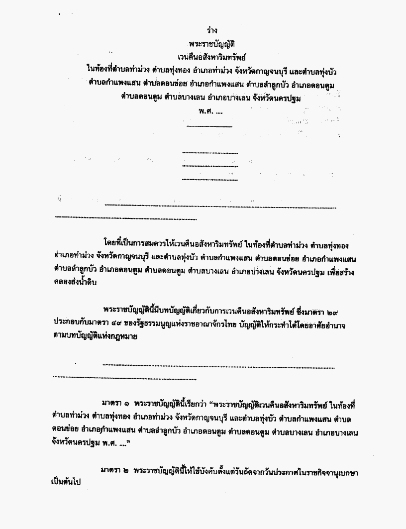 • ร่างพระราชบัญญัติเวนคืนอสังหาริมทรัพย์ ในท้องที่ตำบลท่าม่วง ตำบลทุ่งทอง อำเเภอท่าม่วงจังหวัดกาญจนบุรี และตำบลทุ่งบัว ตำบลกำแพงแสน ตำบลดอนข่อย อำเภอกำแพงแสนตำบลลำลูกบัว อำเภอดอนตูม ตำบลดอนตูม ตำบลบางเลน อำฌอบางเลน จังหวัดนครปฐม พ.ศ. ....
