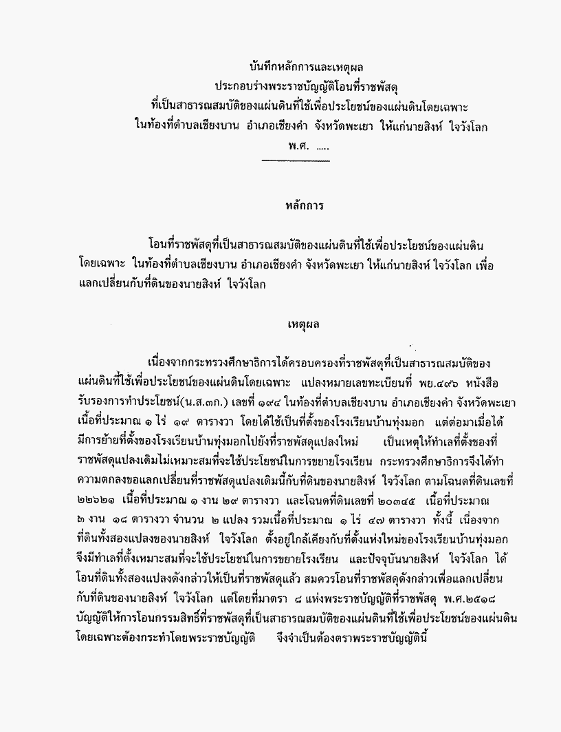 • ร่างพระราชบัญญัติโอนที่ราชพัสดุที่เป็นสาธารณสมบัติของแผ่นดินที่ใช้เพื่อประโยชน์ของแผ่นดินโดยเฉพาะในท้องที่ตำบลเชียงบาน อำเภอเจียงคำ จังหวัดพะเยา ให้แก่ นายสิงห์ ใจวังโลก พ.ศ. ....