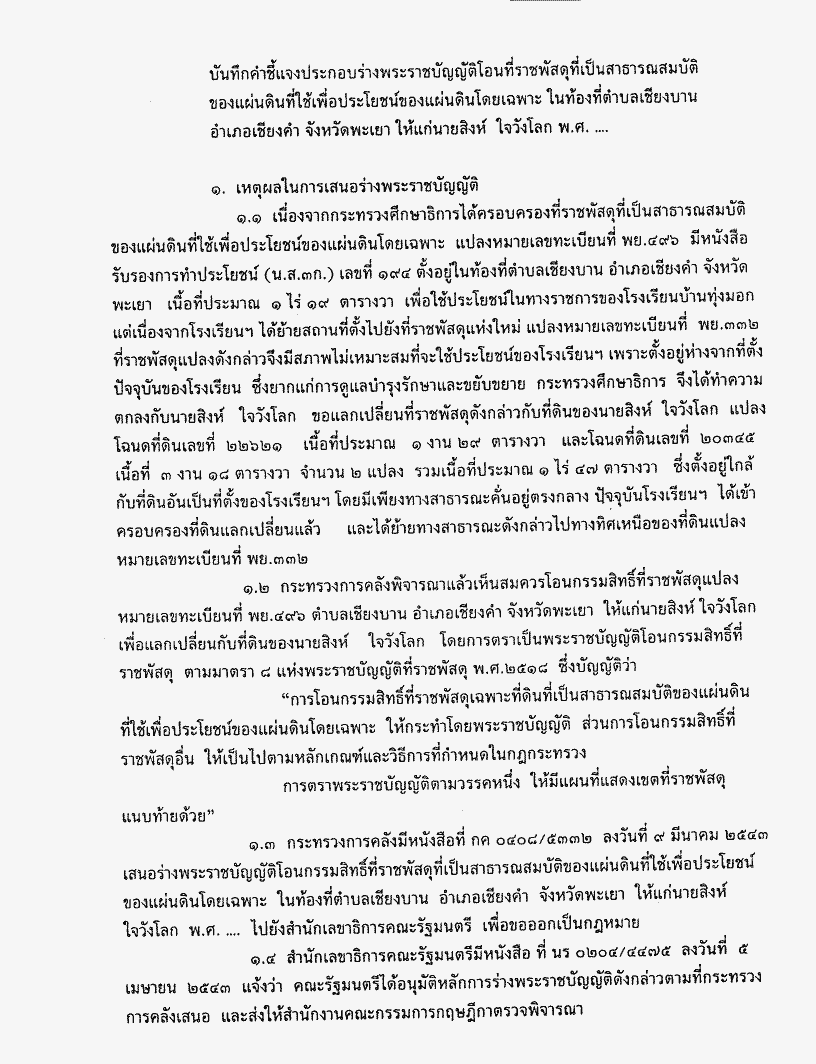 • ร่างพระราชบัญญัติโอนที่ราชพัสดุที่เป็นสาธารณสมบัติของแผ่นดินที่ใช้เพื่อประโยชน์ของแผ่นดินโดยเฉพาะในท้องที่ตำบลเชียงบาน อำเภอเจียงคำ จังหวัดพะเยา ให้แก่ นายสิงห์ ใจวังโลก พ.ศ. ....