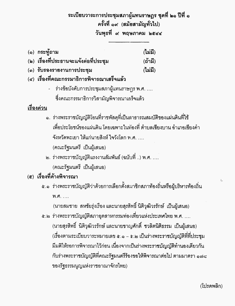 • ระเบียบวาระการประชุมสภาผู้แทนราษฎร ชุดที่ 21 ปีที่ 1 ครั้งที่ 19 (สมัยสามัญทั่วไป) วันพุธที่ 9 พฤษภาคม 2544