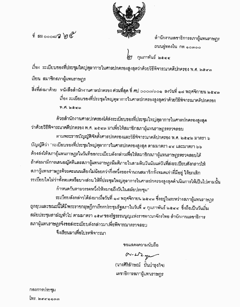 ได้ส่งระเบียบของที่ประชุมใหญ่ตุลาการในศาลปกครองสูงสุด ว่าด้วยวิธีพิจารณาคดีปกครอง พ.ศ. ๒๕๔๓ เพื่อให้ท่านสมาชิกได้ตรวจสอบ ตามเอกสารที่ส่งมาพร้อมนี้