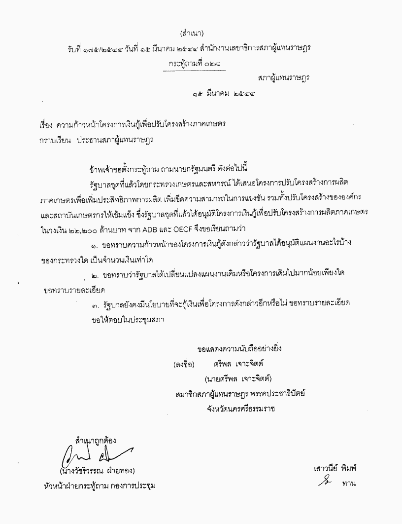 กระทู้ถามที่ 028 เรื่อง ความก้าวหน้าโครงการเงินกู้เพื่อปรับโครงสร้างภาคเกษตร |