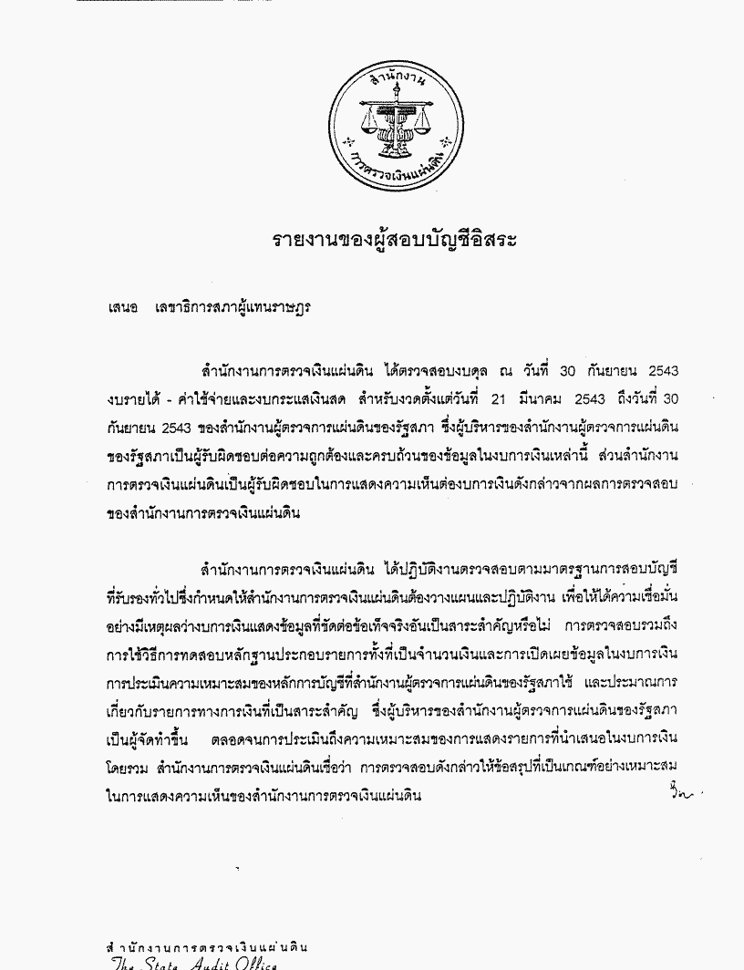 งบการเงินสำหรับงวดตั้งแต่วันที่ 21 มีนาคม 2543 ถึงวันที่ 30 กันยายน 2543 ขอดำเนินสำนักงานผู้ตรวจการแผ่นดินของรัฐสภา |